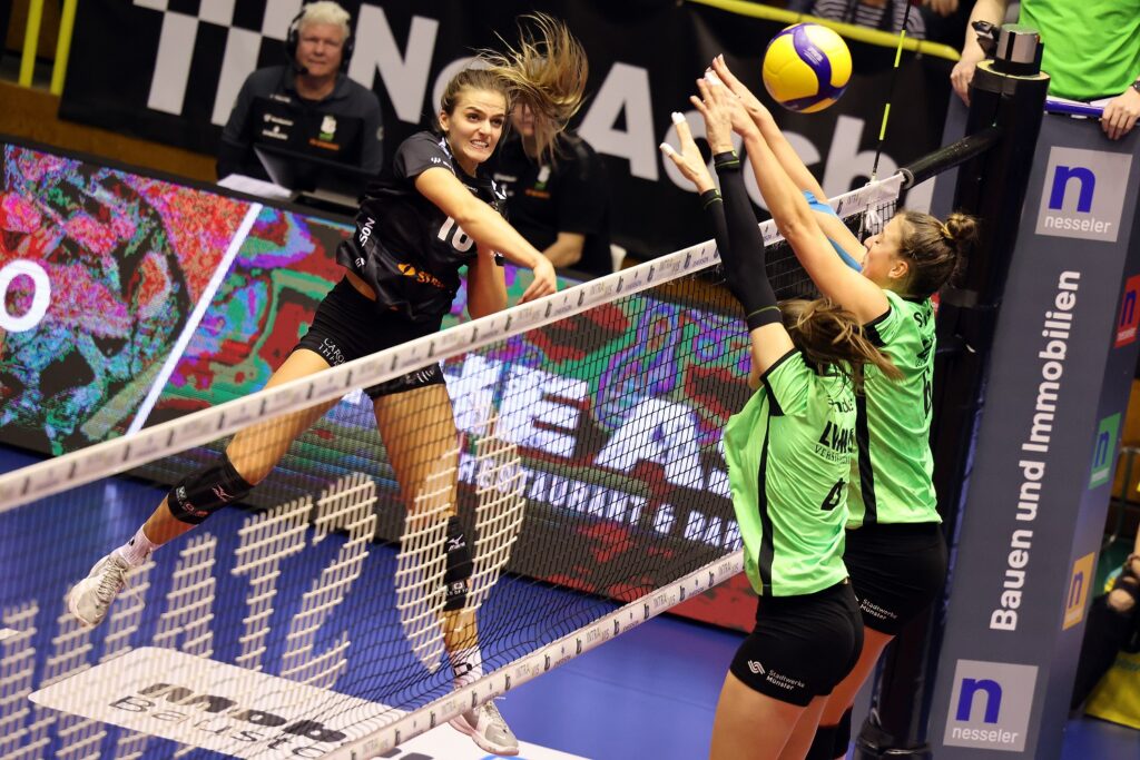 Vor allem im ersten Satz machten die Gastgeberinnen deutlich, dass sie das Spiel nicht einfach verschenken wollten und kamen immer wieder vor allem durch Ex-Lady Anika Brinkmann zu Punkten und hielten lange dagegen.